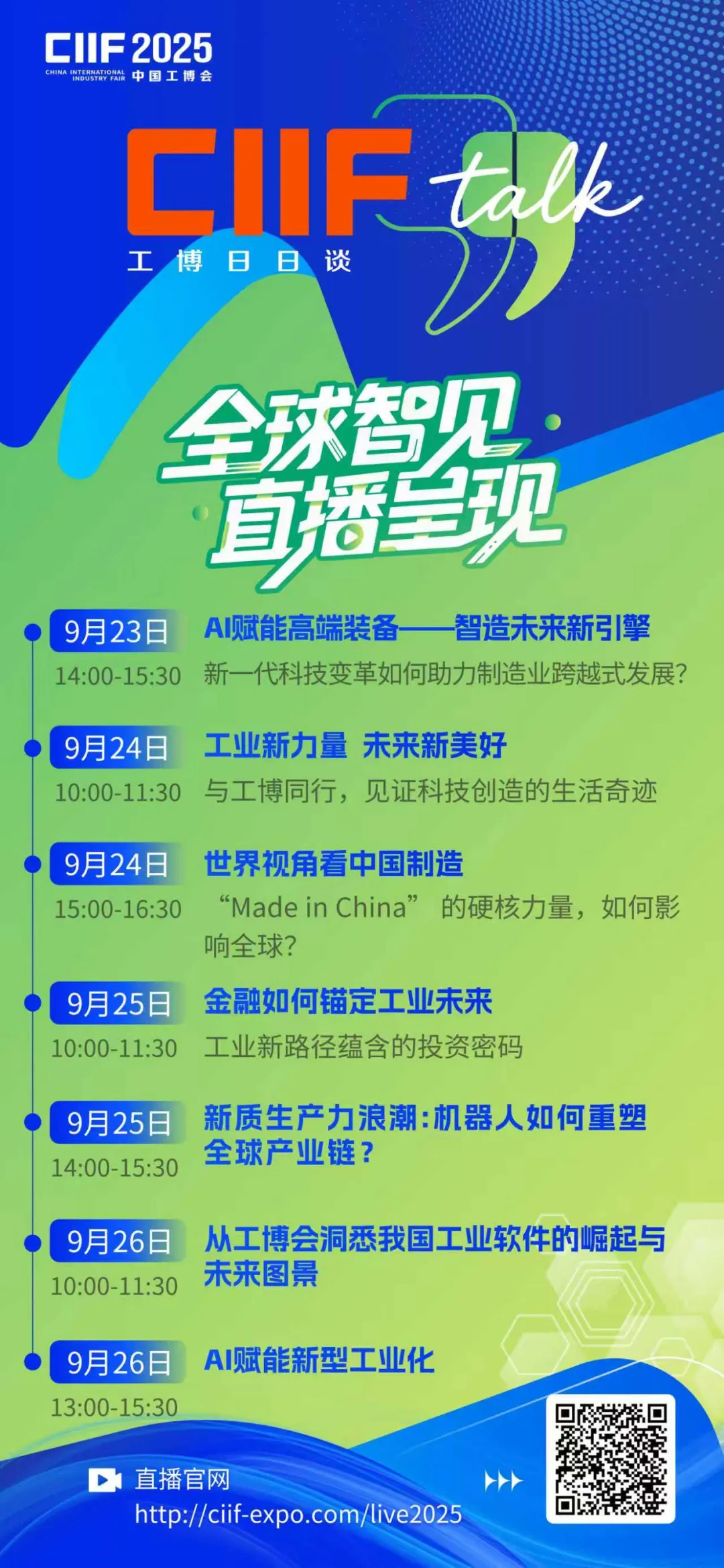 除了精彩的展品呈现,中国工博会还将在展会期间推出七场线上直播对话,CIIF TALK「工博日日谈」融汇智能科技展示与新质产业话题,以专业易懂、互动性强的内容,多维度呈现展会亮点与中国工业发展成果,吸引全球工业界关注。